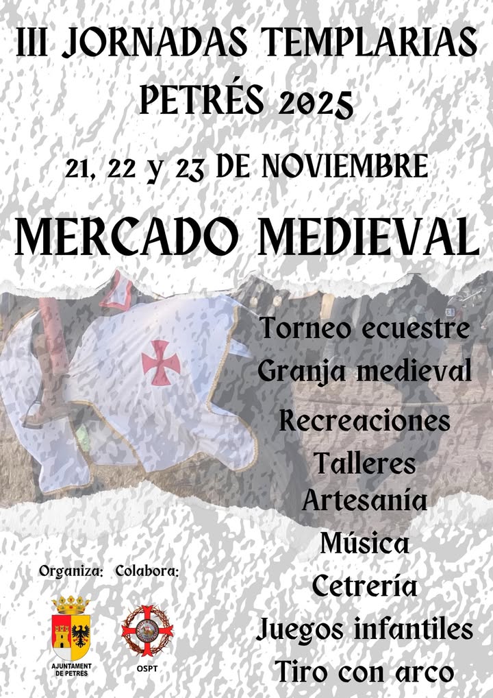 Del 21 al 23 de noviembre de 2025, la Plaza de la Iglesia y los alrededores del Castillo de Petrés acogerán las III Jornadas Templarias en Petrés (Valencia) 2025, un evento que llenará la localidad de historia, tradición y espectáculos inspirados en la época de los caballeros templarios.