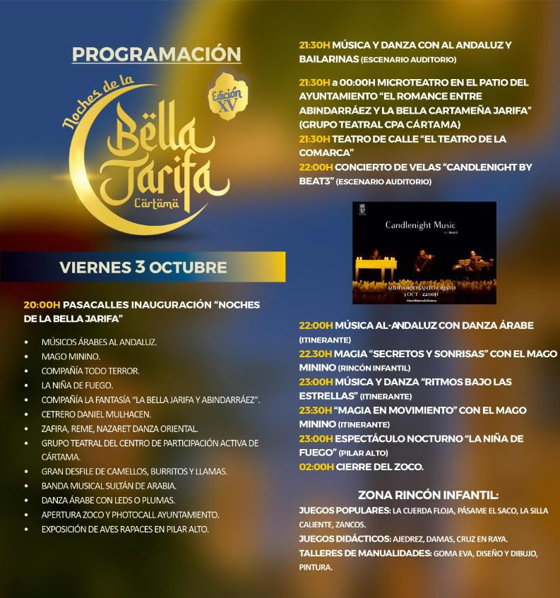 Durante tres noches, las calles del centro de Cártama se iluminan con velas y antorchas, creando una estampa inolvidable. En este marco se levanta un auténtico zoco medieval andalusí, donde se puede disfrutar de: