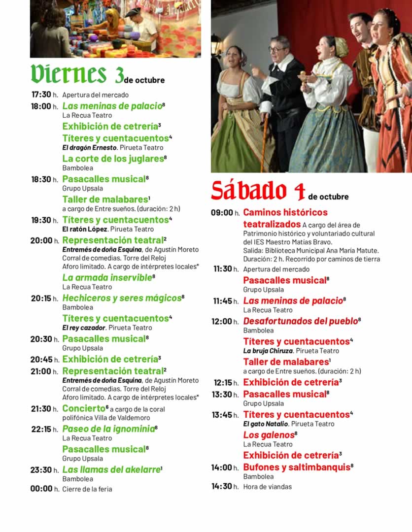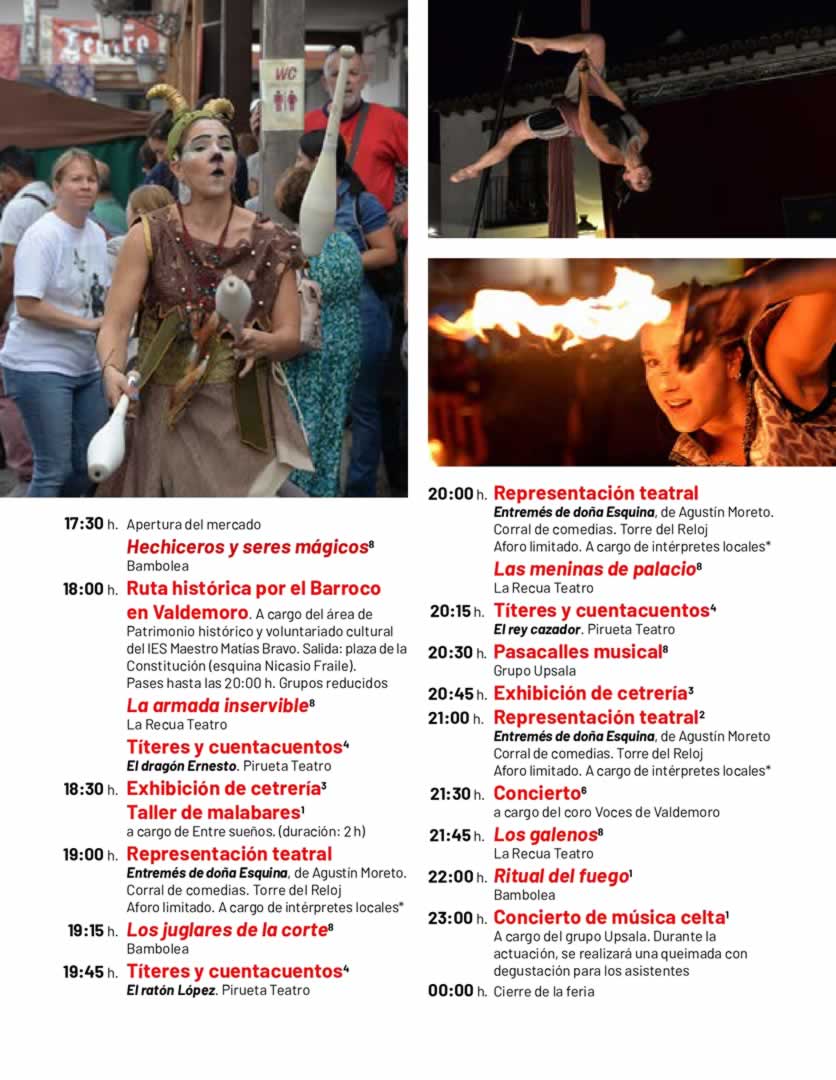 - Espectáculos de calle: cetrería, malabares, fuego, teatro y pasacalles musicales.
