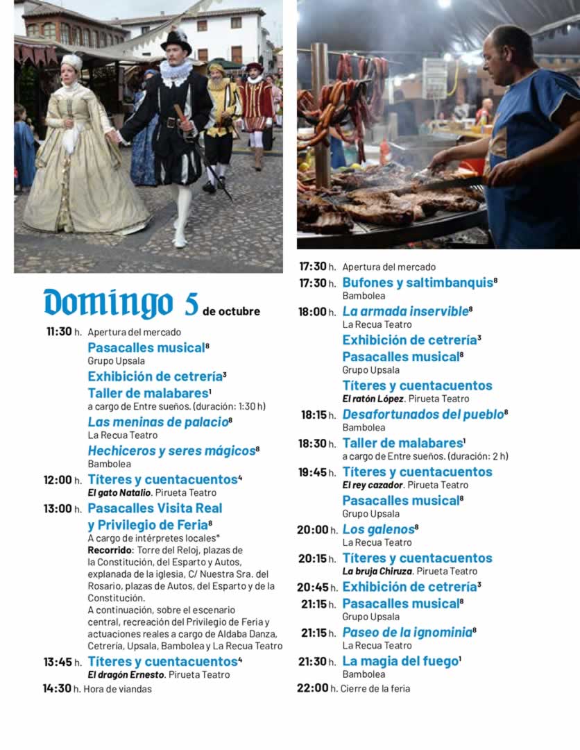 El mercado barroco abrirá el viernes 3 de octubre a las 17:30h y permanecerá activo hasta las 22:00h del domingo 5 de octubre. Durante esos tres días, las actividades se sucederán sin pausa, ofreciendo espectáculos y entretenimiento en cada rincón del municipio.